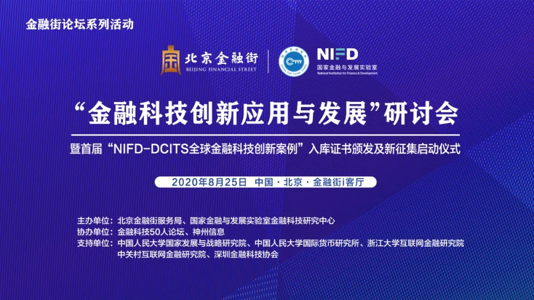 8月25日,由北京金融街服务局、国家金融与发展实验室金融科技研究中心主办,金融科技50人论坛、神州信息协办,中国人民大学国家发展与战略研究院、中国人民大学国际货币研究所、浙江大学互联网金融研究院、中关村互联网金融研究院、深圳市金融科技协会作为学术支持单位的“金融科技创新应用与发展”研讨会暨首届“NIFD-DCITS全球金融科技创新案例”入库证书颁发及新征集启动仪式在金融街i客厅举办。本次会议通过新浪财经、新华财经等平台进行了同步直播。