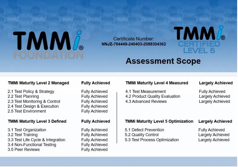 在本次TMMi5级认证过程中,神州信息咨询认证团队依据TMMi基金会推荐使用的IDEAL模型,进行了差距分析、体系优化建模、项目试点、预评估与正式评估等一系列改进和认证评估工作。TMMi咨询评估团队经过客观、认真细致而全面的评估,一致确认今年会融信在TMMi高成熟度方面表现出业界专业水平,完全符合TMMi5级的16个过程域标准。